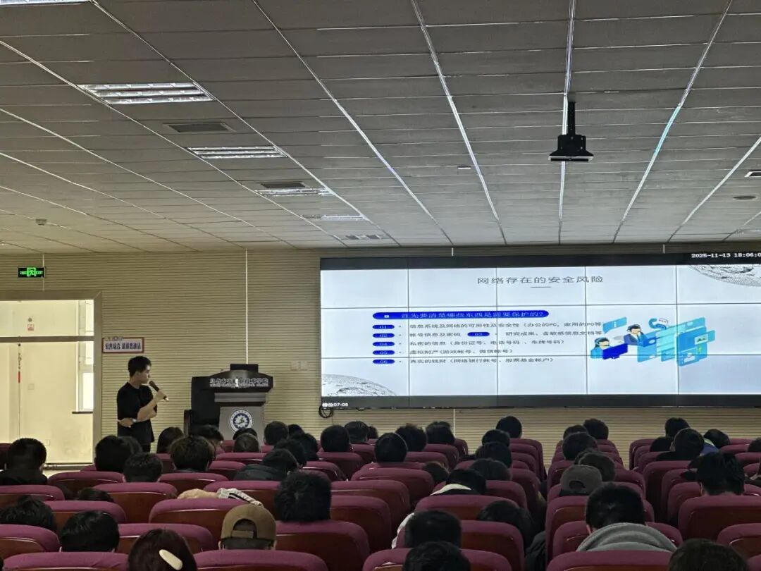 网络早已成为大学生学习生活的 “必需品”,但隐藏在便捷背后的安全风险也不容忽视。为提升学子网络安全意识,掌握实用防护技能,由学院宣传科、信息技术中心、学生工作科联合主办的网络安全专题讲座,分别于11月12日、13日在安宁渠校区、太原路校区顺利开展。中国电信股份有限公司乌鲁木齐分公司云中台安全产品经理倪国杰受邀主讲,为两校区学子带来了一场干货十足的安全知识盛宴。