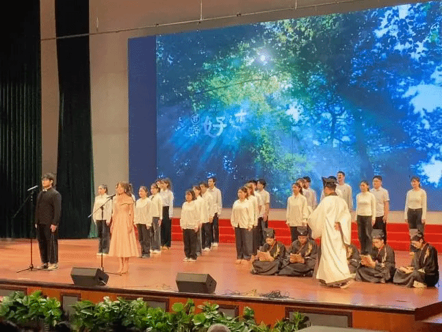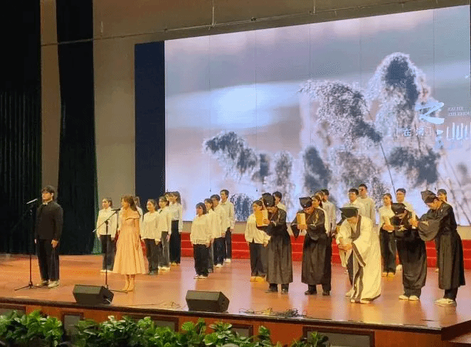 公共基础教育中心“书海航行”读书社团带来的集体朗诵《文脉昭华夏·声颂五千年》惊艳开场。50余名学子身着传统服饰,身姿挺拔,时而抑扬顿挫、时而慷慨激昂,从先秦哲思到唐宋雅韵,从丝路驼铃到新时代强音,用声音勾勒中华文明千年脉络,让观众在朗朗书声中感受文化自信。