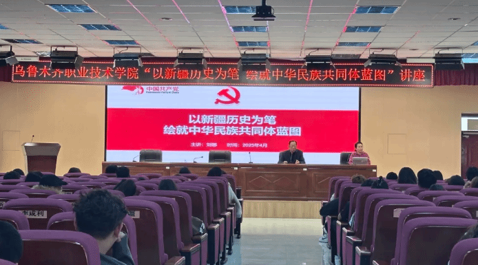 为全面贯彻落实习近平总书记关于铸牢中华民族共同体意识的重要论述,坚持以铸牢中华民族共同体意识为主线做好各项工作,有形、有感、有效铸牢各族学生中华民族共同体意识,营造校园团结友爱、和谐共处的良好氛围,乌鲁木齐职业技术学院于4月2日开展“以新疆历史为笔 绘就中华民族共同体蓝图”专题讲座。本次讲座由第五党支部公共基础教育中心(思政教研组)组长刘娜担任主讲,面向学院400多名高职师生进行宣讲。